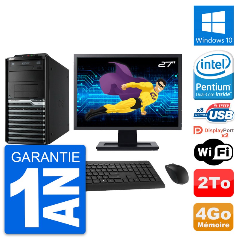 PC Tour Acer M4630G - Intel Pentium Dual-Core G3220 3.0 Ghz (3 Mo) - 4 Go DDR3 - Disque Dur 3,5" 2 To - Graveur DVD - Clef Wifi USB - Windows 10 - Livré avec Ecran 27" + clavier + souris (Marques et modèles variables) - Garantie 1 an.