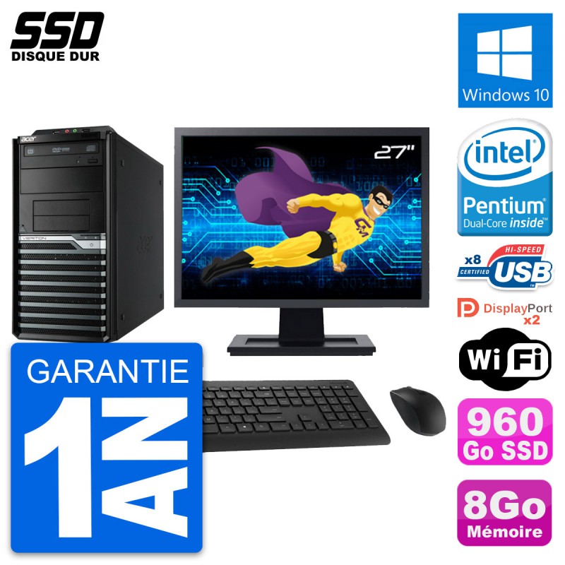 PC Tour Acer M4630G - Intel Pentium Dual-Core G3220 3.0 Ghz (3 Mo) - 8 Go DDR3 - Disque Dur SSD 960 Go - Graveur DVD - Clef Wifi USB - Windows 10 - Livré avec Ecran 27" + clavier + souris (Marques et modèles variables) - Garantie 1 an.