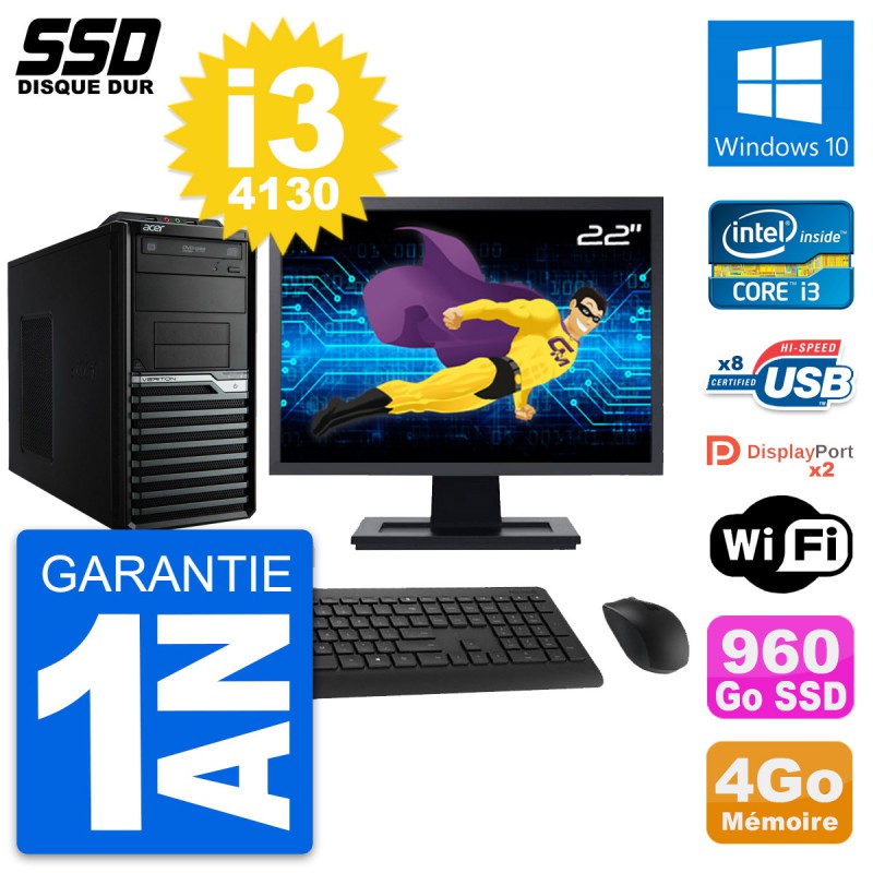 PC Tour Acer M4630G - Intel Core i3-4130 3.4 Ghz (3 Mo) - 4 Go DDR3 - Disque Dur SSD 960 Go - Graveur DVD - Clef Wifi USB - Windows 10 - Livré avec Ecran 22" + clavier + souris (Marques et modèles variables) - Garantie 1 an.