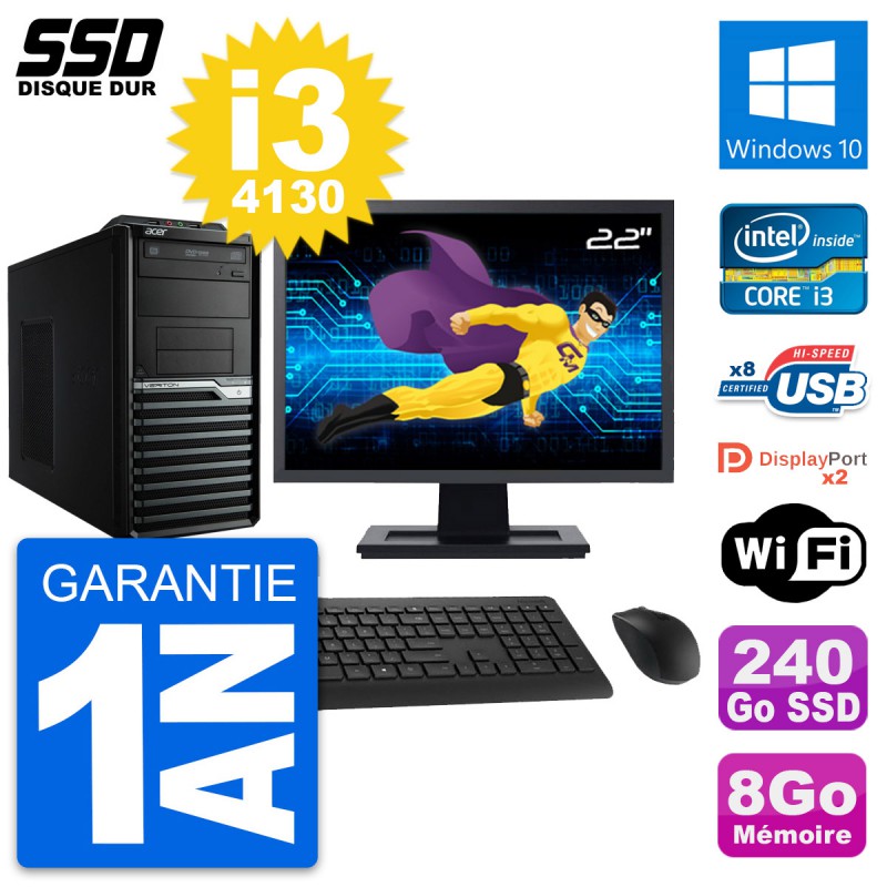 PC Tour Acer M4630G - Intel Core i3-4130 3.4 Ghz (3 Mo) - 8 Go DDR3 - Disque Dur SSD 240 Go - Graveur DVD - Clef Wifi USB - Windows 10 - Livré avec Ecran 22" + clavier + souris (Marques et modèles variables) - Garantie 1 an.