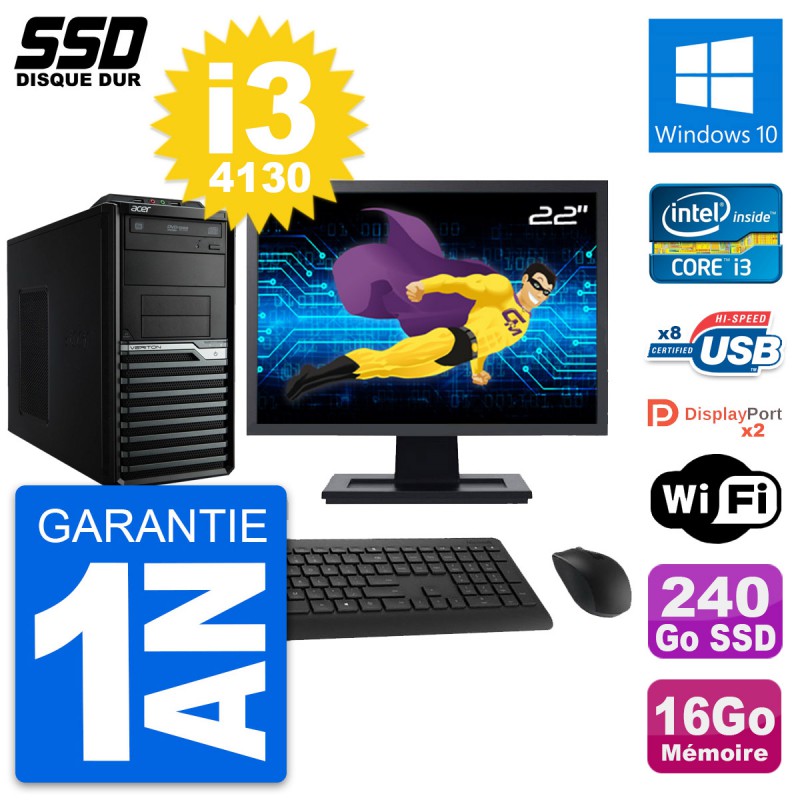 PC Tour Acer M4630G - Intel Core i3-4130 3.4 Ghz (3 Mo) - 16 Go DDR3 - Disque Dur SSD 240 Go - Graveur DVD - Clef Wifi USB - Windows 10 - Livré avec Ecran 22" + clavier + souris (Marques et modèles variables) - Garantie 1 an.