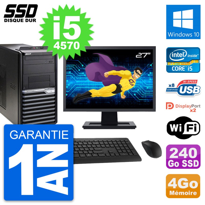 PC Tour Acer M4630G - Intel Core i5-4570 3.2 Ghz (6 Mo) - 4 Go DDR3 - Disque Dur SSD 240 Go - Graveur DVD - Clef Wifi USB - Windows 10 - Livré avec Ecran 27" + clavier + souris (Marques et modèles variables) - Garantie 1 an.