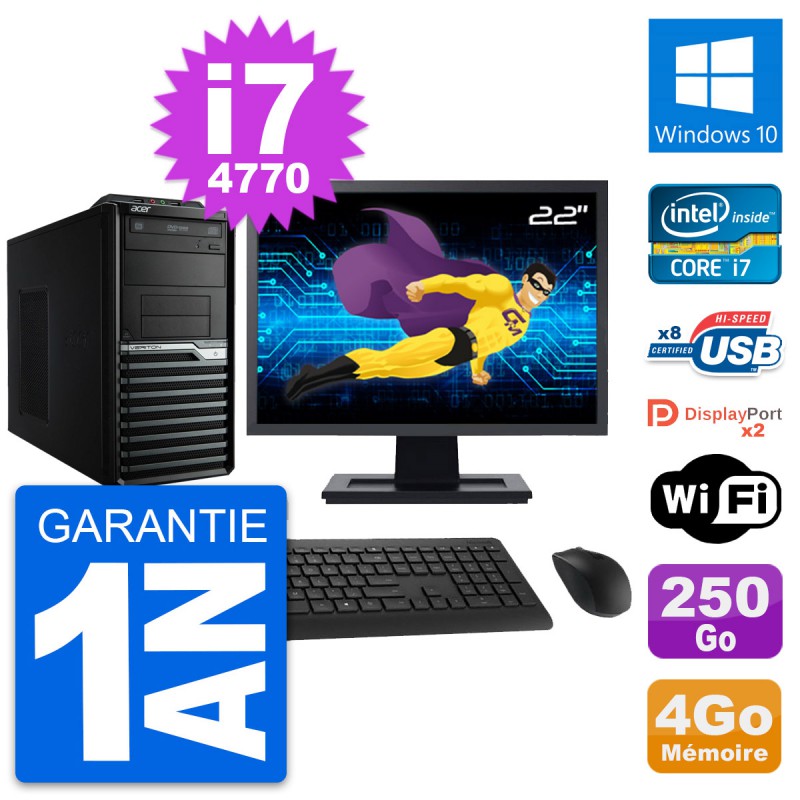 PC Tour Acer M4630G - Intel Core i7-4770 3.4 Ghz (8 Mo) - 4 Go DDR3 - Disque Dur 3,5" 250 Go - Graveur DVD - Clef Wifi USB - Windows 10 - Livré avec Ecran 22" + clavier + souris (Marques et modèles variables) - Garantie 1 an.
