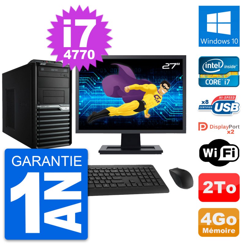 PC Tour Acer M4630G - Intel Core i7-4770 3.4 Ghz (8 Mo) - 4 Go DDR3 - Disque Dur 3,5" 2 To - Graveur DVD - Clef Wifi USB - Windows 10 - Livré avec Ecran 27" + clavier + souris (Marques et modèles variables) - Garantie 1 an.