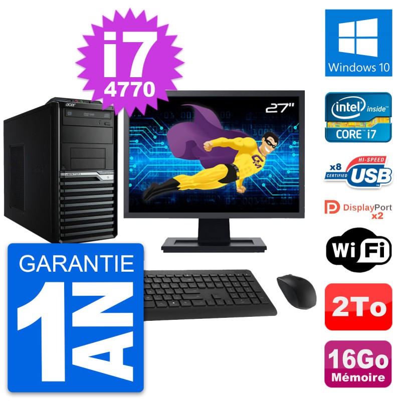 PC Tour Acer M4630G - Intel Core i7-4770 3.4 Ghz (8 Mo) - 16 Go DDR3 - Disque Dur 3,5" 2 To - Graveur DVD - Clef Wifi USB - Windows 10 - Livré avec Ecran 27" + clavier + souris (Marques et modèles variables) - Garantie 1 an.