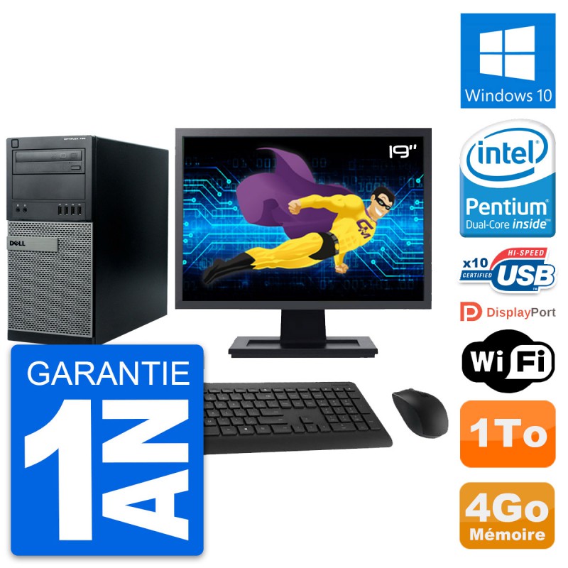 PC Tour Dell 790 MT - Intel Pentium Dual-Core G630 2.7 Ghz (3 Mo) - 4 Go DDR3 - Disque Dur 3,5" 1 To - Graveur DVD - Clef Wifi USB - Windows 10 - Livré avec Ecran 19" + clavier + souris (Marques et modèles variables) - Garantie 1 an.