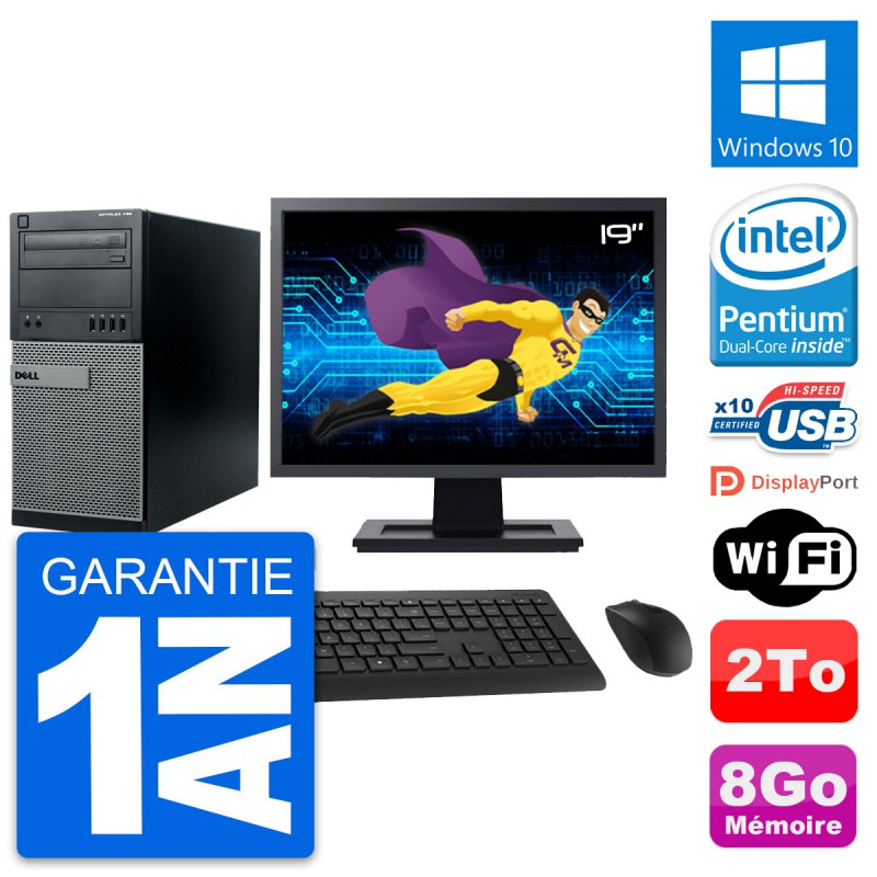 PC Tour Dell 790 MT - Intel Pentium Dual-Core G630 2.7 Ghz (3 Mo) - 8 Go DDR3 - Disque Dur 3,5" 2 To - Graveur DVD - Clef Wifi USB - Windows 10 - Livré avec Ecran 19" + clavier + souris (Marques et modèles variables) - Garantie 1 an.