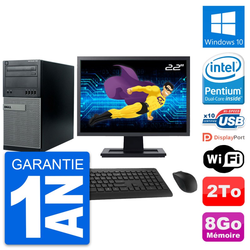 PC Tour Dell 790 MT - Intel Pentium Dual-Core G630 2.7 Ghz (3 Mo) - 8 Go DDR3 - Disque Dur 3,5" 2 To - Graveur DVD - Clef Wifi USB - Windows 10 - Livré avec Ecran 22" + clavier + souris (Marques et modèles variables) - Garantie 1 an.