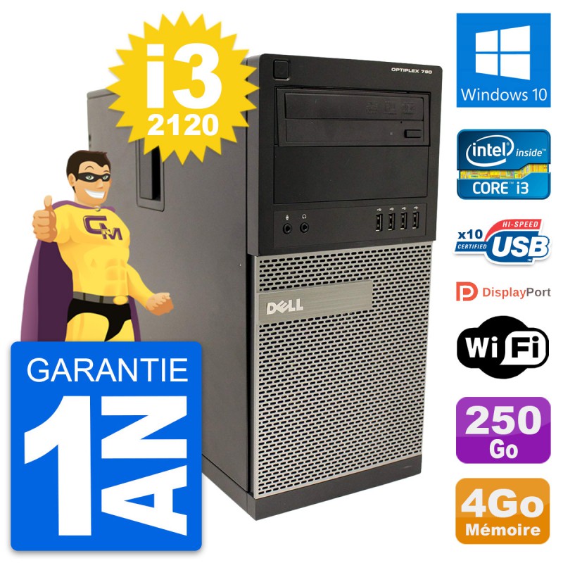 PC Tour Dell OptiPlex 790 MT - Intel Core i3-2120 3.3 Ghz (3 Mo) - 4 Go DDR3 - Disque Dur 3,5" 250 Go - Graveur DVD - Clef Wifi USB - Windows 10 - Garantie 1 an.