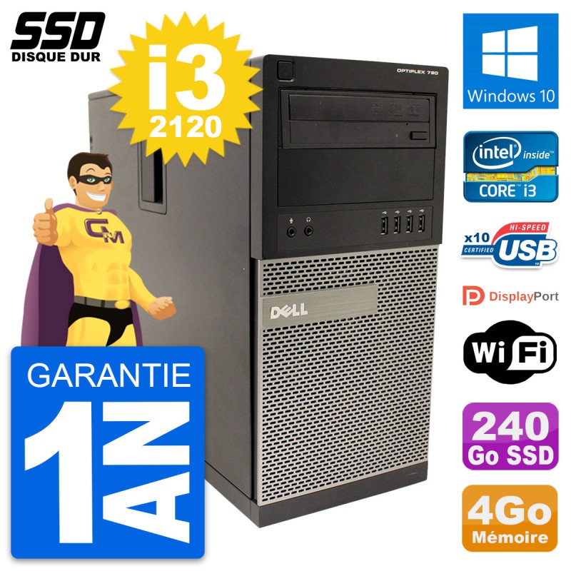 PC Tour Dell OptiPlex 790 MT - Intel Core i3-2120 3.3 Ghz (3 Mo) - 4 Go DDR3 - Disque Dur SSD 240 Go - Graveur DVD - Clef Wifi USB - Windows 10 - Garantie 1 an.