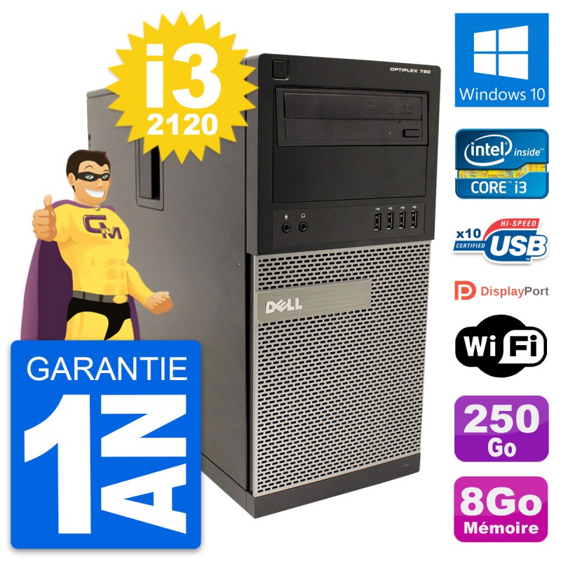 PC Tour Dell OptiPlex 790 MT - Intel Core i3-2120 3.3 Ghz (3 Mo) - 8 Go DDR3 - Disque Dur 3,5" 250 Go - Graveur DVD - Clef Wifi USB - Windows 10 - Garantie 1 an.