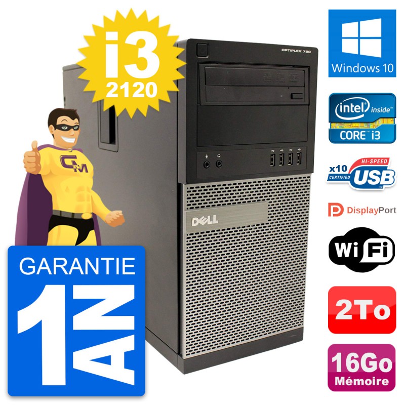 PC Tour Dell OptiPlex 790 MT - Intel Core i3-2120 3.3 Ghz (3 Mo) - 16 Go DDR3 - Disque Dur 3,5" 2 To - Graveur DVD - Clef Wifi USB - Windows 10 - Garantie 1 an.