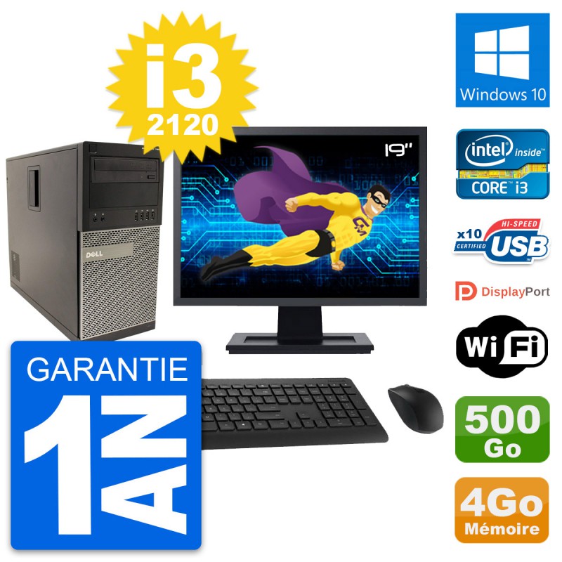 PC Tour Dell 790 MT - Intel Core i3-2120 3.3 Ghz (3 Mo) - 4 Go DDR3 - Disque Dur 3,5" 500 Go - Graveur DVD - Clef Wifi USB - Windows 10 - Livré avec Ecran 19" + clavier + souris (Marques et modèles variables) - Garantie 1 an.
