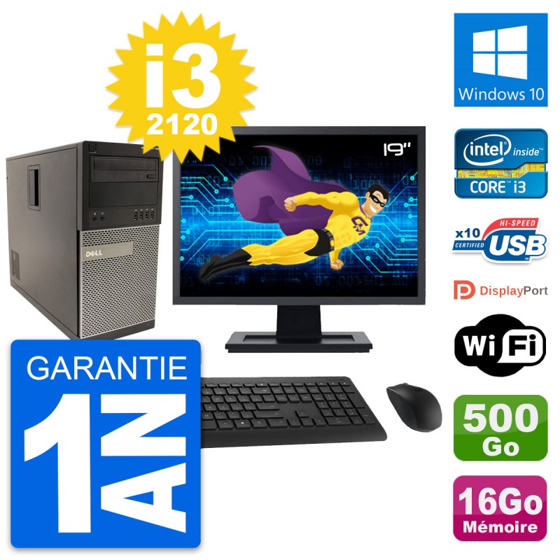 PC Tour Dell 790 MT - Intel Core i3-2120 3.3 Ghz (3 Mo) - 16 Go DDR3 - Disque Dur 3,5" 500 Go - Graveur DVD - Clef Wifi USB - Windows 10 - Livré avec Ecran 19" + clavier + souris (Marques et modèles variables) - Garantie 1 an.