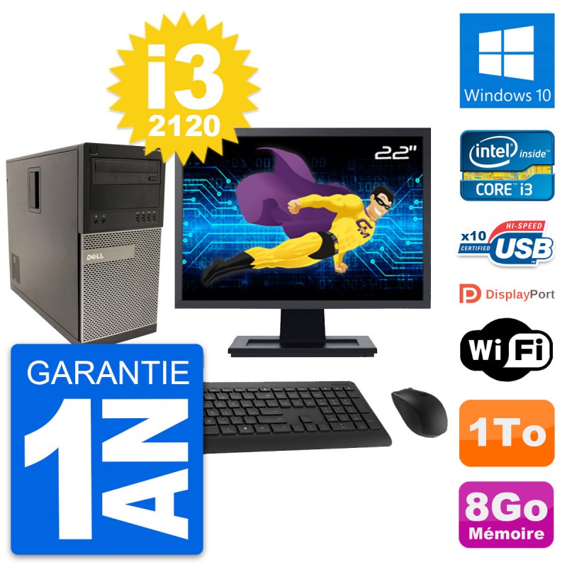 PC Tour Dell 790 MT - Intel Core i3-2120 3.3 Ghz (3 Mo) - 8 Go DDR3 - Disque Dur 3,5" 1 To - Graveur DVD - Clef Wifi USB - Windows 10 - Livré avec Ecran 22" + clavier + souris (Marques et modèles variables) - Garantie 1 an.