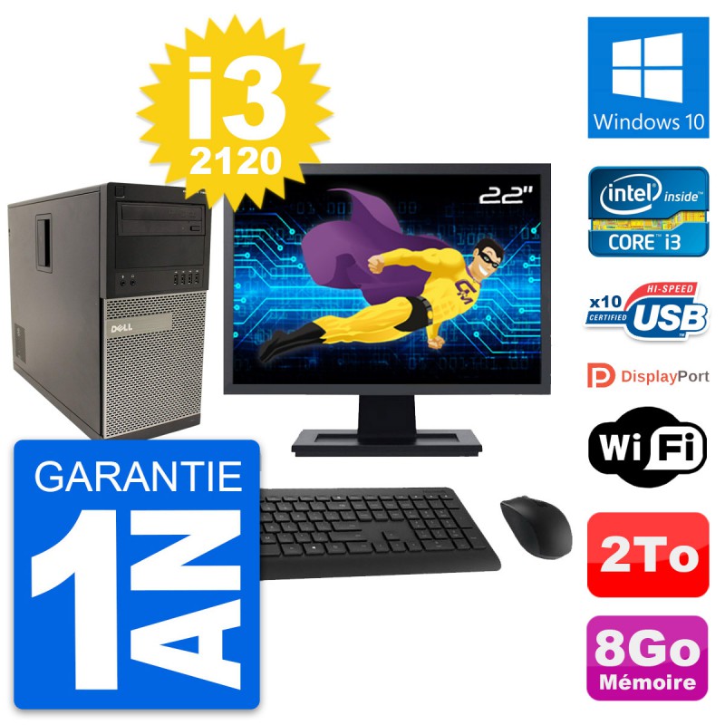 PC Tour Dell 790 MT - Intel Core i3-2120 3.3 Ghz (3 Mo) - 8 Go DDR3 - Disque Dur 3,5" 2 To - Graveur DVD - Clef Wifi USB - Windows 10 - Livré avec Ecran 22" + clavier + souris (Marques et modèles variables) - Garantie 1 an.