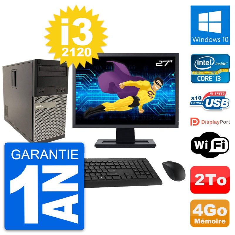 PC Tour Dell 790 MT - Intel Core i3-2120 3.3 Ghz (3 Mo) - 4 Go DDR3 - Disque Dur 3,5" 2 To - Graveur DVD - Clef Wifi USB - Windows 10 - Livré avec Ecran 27" + clavier + souris (Marques et modèles variables) - Garantie 1 an.