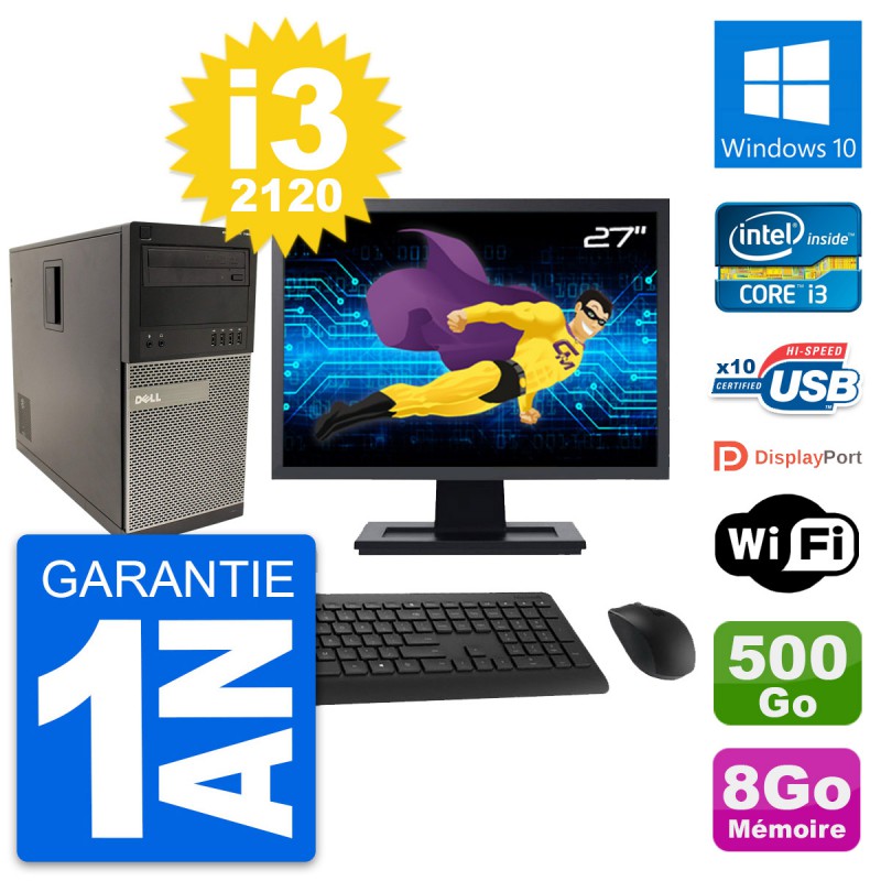 PC Tour Dell 790 MT - Intel Core i3-2120 3.3 Ghz (3 Mo) - 8 Go DDR3 - Disque Dur 3,5" 500 Go - Graveur DVD - Clef Wifi USB - Windows 10 - Livré avec Ecran 27" + clavier + souris (Marques et modèles variables) - Garantie 1 an.