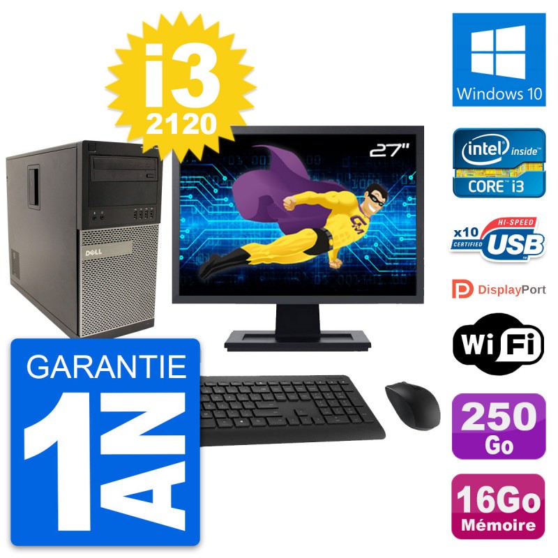PC Tour Dell 790 MT - Intel Core i3-2120 3.3 Ghz (3 Mo) - 16 Go DDR3 - Disque Dur 3,5" 250 Go - Graveur DVD - Clef Wifi USB - Windows 10 - Livré avec Ecran 27" + clavier + souris (Marques et modèles variables) - Garantie 1 an.