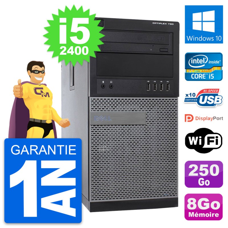 PC Tour Dell OptiPlex 790 MT - Intel Core i5-2400 3.1 Ghz (6 Mo) - 8 Go DDR3 - Disque Dur 3,5" 250 Go - Graveur DVD - Clef Wifi USB - Windows 10 - Garantie 1 an.