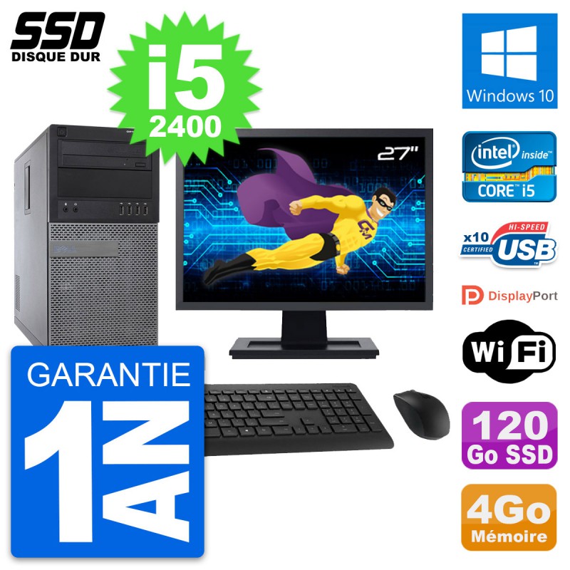 PC Tour Dell 790 MT - Intel Core i5-2400 3.1 Ghz (6 Mo) - 4 Go DDR3 - Disque Dur SSD 120 Go - Graveur DVD - Clef Wifi USB - Windows 10 - Livré avec Ecran 27" + clavier + souris (Marques et modèles variables) - Garantie 1 an.