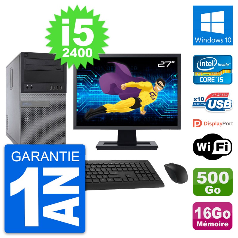 PC Tour Dell 790 MT - Intel Core i5-2400 3.1 Ghz (6 Mo) - 16 Go DDR3 - Disque Dur 3,5" 500 Go - Graveur DVD - Clef Wifi USB - Windows 10 - Livré avec Ecran 27" + clavier + souris (Marques et modèles variables) - Garantie 1 an.
