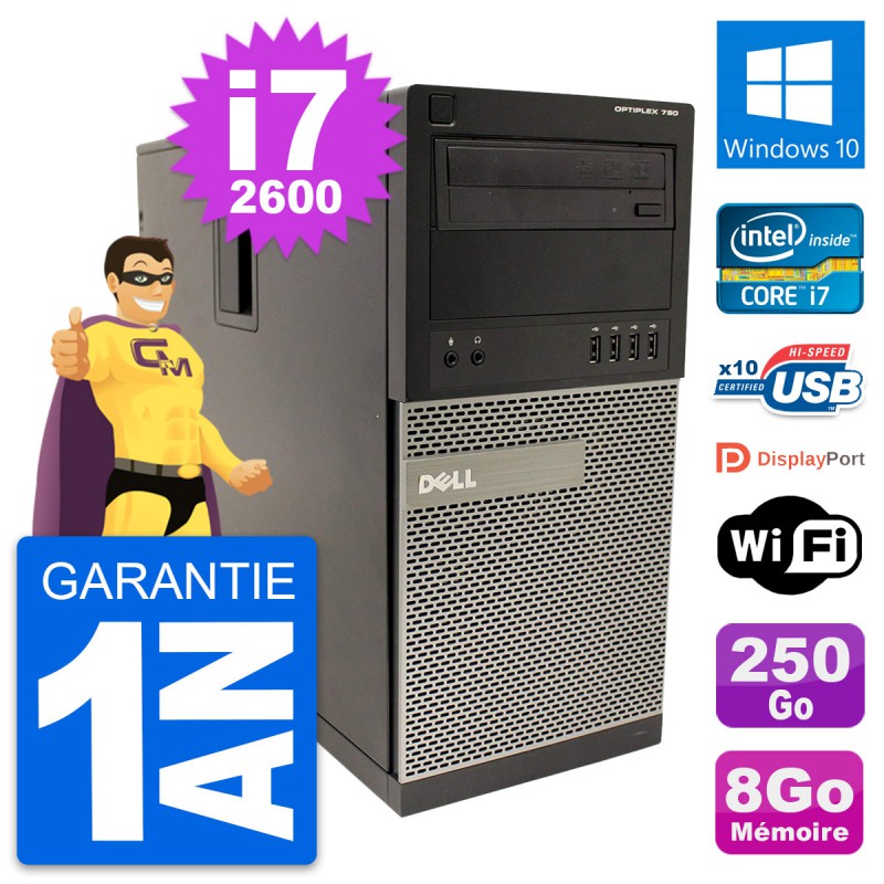 PC Tour Dell OptiPlex 790 MT - Intel Core i7-2600 3.4 Ghz (8 Mo) - 8 Go DDR3 - Disque Dur 3,5" 250 Go - Graveur DVD - Clef Wifi USB - Windows 10 - Garantie 1 an.