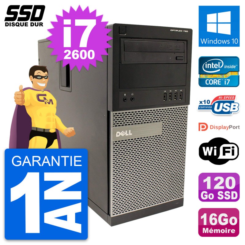 PC Tour Dell OptiPlex 790 MT - Intel Core i7-2600 3.4 Ghz (8 Mo) - 16 Go DDR3 - Disque Dur SSD 120 Go - Graveur DVD - Clef Wifi USB - Windows 10 - Garantie 1 an.
