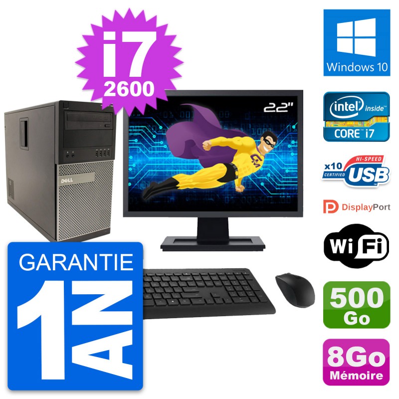 PC Tour Dell 790 MT - Intel Core i7-2600 3.4 Ghz (8 Mo) - 8 Go DDR3 - Disque Dur 3,5" 500 Go - Graveur DVD - Clef Wifi USB - Windows 10 - Livré avec Ecran 22" + clavier + souris (Marques et modèles variables) - Garantie 1 an.