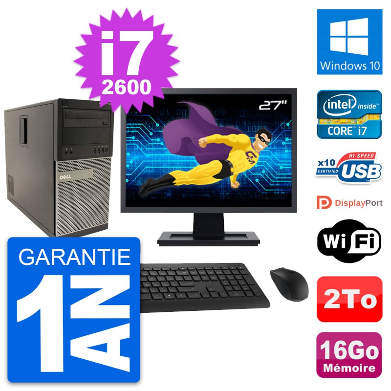PC Tour Dell 790 MT - Intel Core i7-2600 3.4 Ghz (8 Mo) - 16 Go DDR3 - Disque Dur 3,5" 2 To - Graveur DVD - Clef Wifi USB - Windows 10 - Livré avec Ecran 27" + clavier + souris (Marques et modèles variables) - Garantie 1 an.