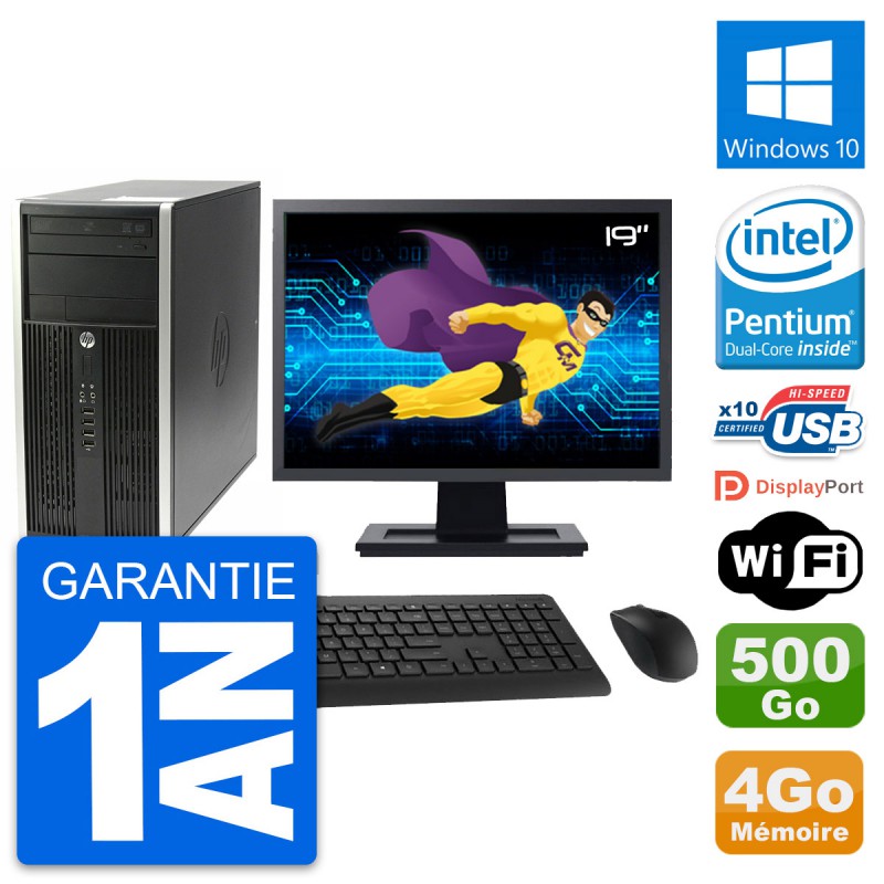 PC HP Pro 6200 CMT (Micro Tour) - Intel Pentium Dual-Core G630 2.7 Ghz (3 Mo) - 4 Go DDR3 - Disque Dur 3,5" 500 Go - Graveur DVD - Clef Wifi USB - Windows 10 - Livré avec Ecran 19" + clavier + souris (Marques et modèles variables) - Garantie 1 an.