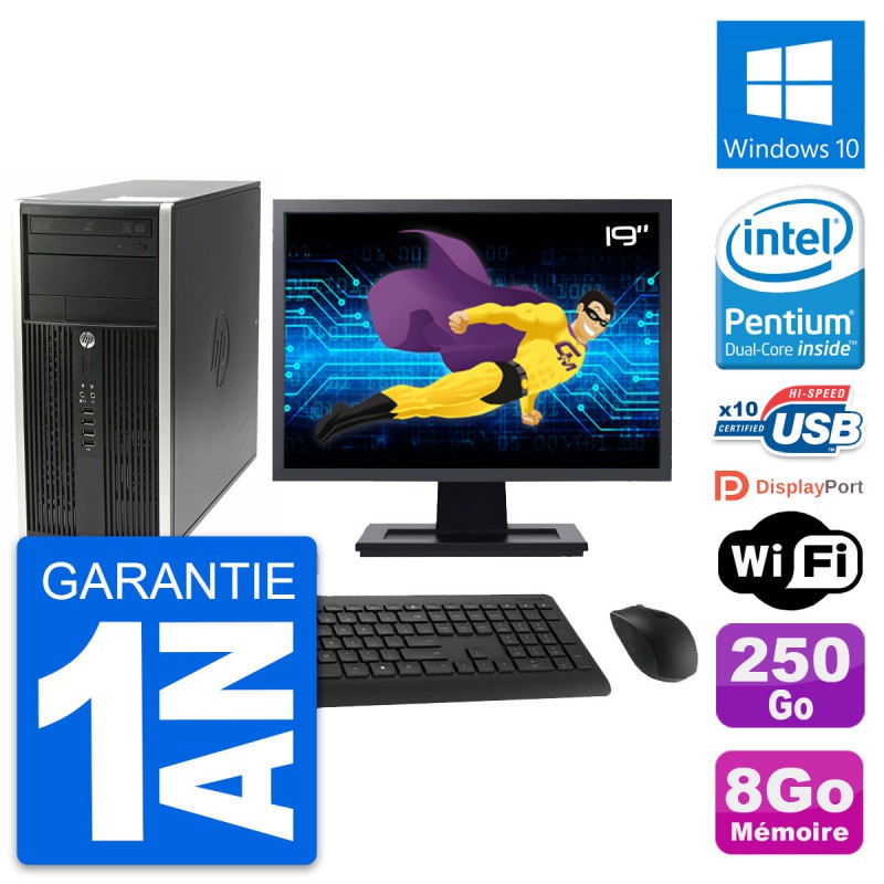 PC HP Pro 6200 CMT (Micro Tour) - Intel Pentium Dual-Core G630 2.7 Ghz (3 Mo) - 8 Go DDR3 - Disque Dur 3,5" 250 Go - Graveur DVD - Clef Wifi USB - Windows 10 - Livré avec Ecran 19" + clavier + souris (Marques et modèles variables) - Garantie 1 an.
