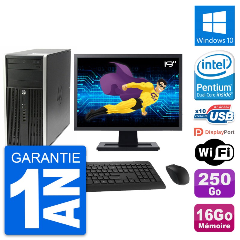 PC HP Pro 6200 CMT (Micro Tour) - Intel Pentium Dual-Core G630 2.7 Ghz (3 Mo) - 16 Go DDR3 - Disque Dur 3,5" 250 Go - Graveur DVD - Clef Wifi USB - Windows 10 - Livré avec Ecran 19" + clavier + souris (Marques et modèles variables) - Garantie 1 an.