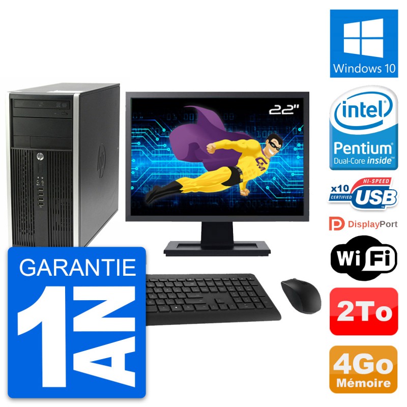 PC HP Pro 6200 CMT (Micro Tour) - Intel Pentium Dual-Core G630 2.7 Ghz (3 Mo) - 4 Go DDR3 - Disque Dur 3,5" 2 To - Graveur DVD - Clef Wifi USB - Windows 10 - Livré avec Ecran 22" + clavier + souris (Marques et modèles variables) - Garantie 1 an.