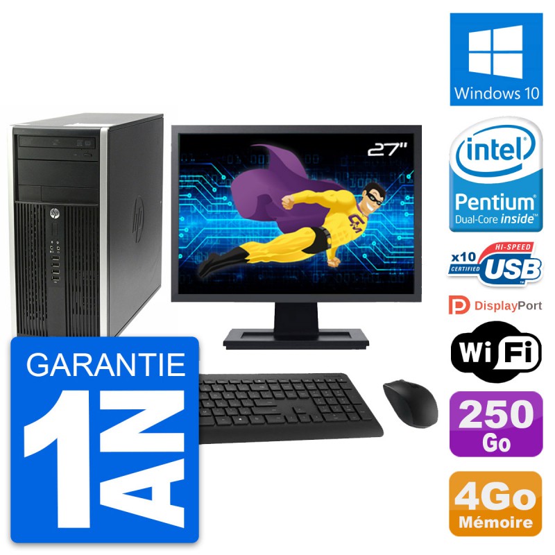 PC HP Pro 6200 CMT (Micro Tour) - Intel Pentium Dual-Core G630 2.7 Ghz (3 Mo) - 4 Go DDR3 - Disque Dur 3,5" 250 Go - Graveur DVD - Clef Wifi USB - Windows 10 - Livré avec Ecran 27" + clavier + souris (Marques et modèles variables) - Garantie 1 an.