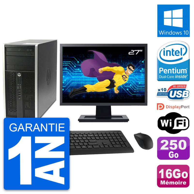 PC HP Pro 6200 CMT (Micro Tour) - Intel Pentium Dual-Core G630 2.7 Ghz (3 Mo) - 16 Go DDR3 - Disque Dur 3,5" 250 Go - Graveur DVD - Clef Wifi USB - Windows 10 - Livré avec Ecran 27" + clavier + souris (Marques et modèles variables) - Garantie 1 an.
