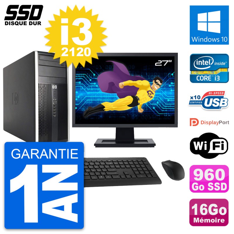 PC Tour HP 6200 CMT Ecran 27" Intel i3-2120 RAM 16Go SSD 960Go Windows 10 Wifi