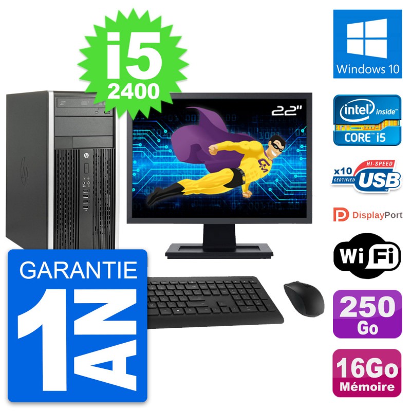 PC HP Pro 6200 CMT (Micro Tour) - Intel Core i5-2400 3.1 Ghz (6 Mo) - 16 Go DDR3 - Disque Dur 3,5" 250 Go - Graveur DVD - Clef Wifi USB - Windows 10 - Livré avec Ecran 22" + clavier + souris (Marques et modèles variables) - Garantie 1 an.