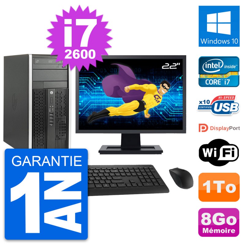 PC HP Pro 6200 CMT (Micro Tour) - Intel Core i7-2600 3.4 Ghz (8 Mo) - 8 Go DDR3 - Disque Dur 3,5" 1 To - Graveur DVD - Clef Wifi USB - Windows 10 - Livré avec Ecran 22" + clavier + souris (Marques et modèles variables) - Garantie 1 an.