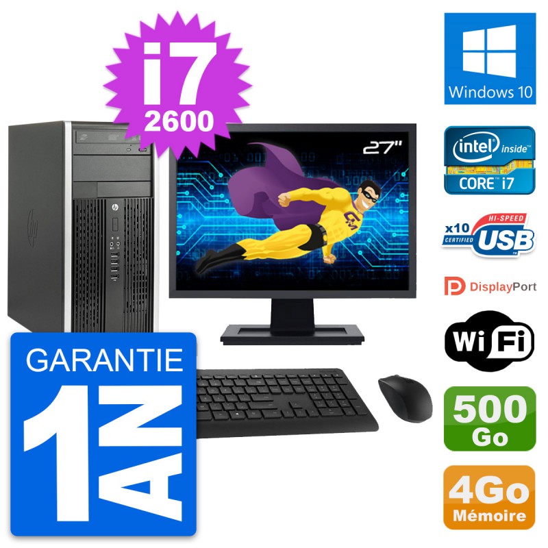 PC HP Pro 6200 CMT (Micro Tour) - Intel Core i7-2600 3.4 Ghz (8 Mo) - 4 Go DDR3 - Disque Dur 3,5" 500 Go - Graveur DVD - Clef Wifi USB - Windows 10 - Livré avec Ecran 27" + clavier + souris (Marques et modèles variables) - Garantie 1 an.