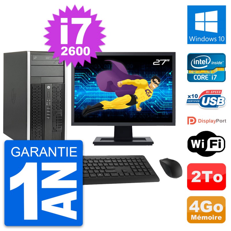 PC HP Pro 6200 CMT (Micro Tour) - Intel Core i7-2600 3.4 Ghz (8 Mo) - 4 Go DDR3 - Disque Dur 3,5" 2 To - Graveur DVD - Clef Wifi USB - Windows 10 - Livré avec Ecran 27" + clavier + souris (Marques et modèles variables) - Garantie 1 an.