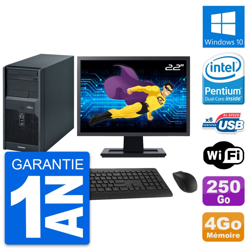 PC Tour Fujitsu P2560 - Intel Pentium Dual-Core E5500 2.8 Ghz (2 Mo) - 4 Go DDR3 - Disque Dur 3,5" 250 Go - Graveur DVD - Clef Wifi USB - Windows 10 - Livré avec Ecran 22" + clavier + souris (Marques et modèles variables) - Garantie 1 an.