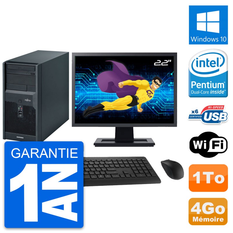 PC Tour Fujitsu P2560 - Intel Pentium Dual-Core E5500 2.8 Ghz (2 Mo) - 4 Go DDR3 - Disque Dur 3,5" 1 To - Graveur DVD - Clef Wifi USB - Windows 10 - Livré avec Ecran 22" + clavier + souris (Marques et modèles variables) - Garantie 1 an.