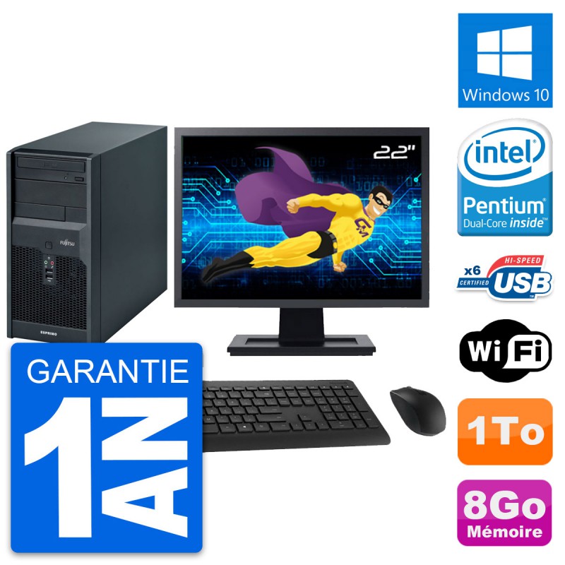 PC Tour Fujitsu P2560 - Intel Pentium Dual-Core E5500 2.8 Ghz (2 Mo) - 8 Go DDR3 - Disque Dur 3,5" 1 To - Graveur DVD - Clef Wifi USB - Windows 10 - Livré avec Ecran 22" + clavier + souris (Marques et modèles variables) - Garantie 1 an.