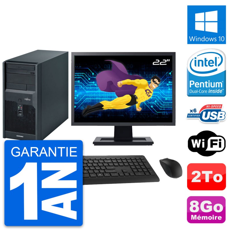 PC Tour Fujitsu P2560 - Intel Pentium Dual-Core E5500 2.8 Ghz (2 Mo) - 8 Go DDR3 - Disque Dur 3,5" 2 To - Graveur DVD - Clef Wifi USB - Windows 10 - Livré avec Ecran 22" + clavier + souris (Marques et modèles variables) - Garantie 1 an.