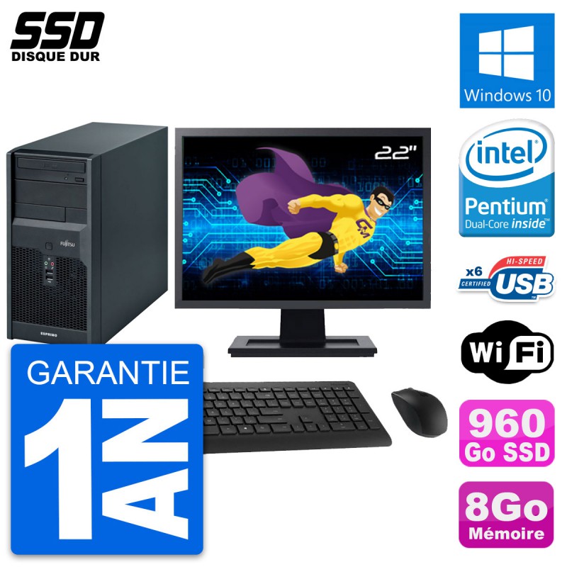 PC Tour Fujitsu P2560 - Intel Pentium Dual-Core E5500 2.8 Ghz (2 Mo) - 8 Go DDR3 - Disque Dur SSD 960 Go - Graveur DVD - Clef Wifi USB - Windows 10 - Livré avec Ecran 22" + clavier + souris (Marques et modèles variables) - Garantie 1 an.