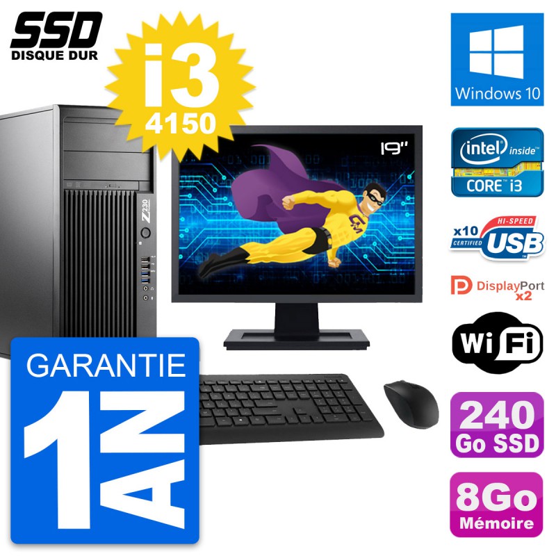 PC Tour HP WorkStation Z230 - Intel Core i3-4150 3.5 Ghz (3 Mo) - 8 Go DDR3 - Disque Dur SSD 240 Go - Graveur DVD - Clef Wifi USB - Windows 10 - Livré avec Ecran 19" + clavier + souris (Marques et modèles variables) - Garantie 1 an.