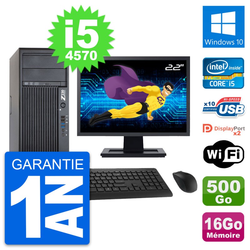 PC Tour HP WorkStation Z230 - Intel Core i5-4570 3.2 Ghz (6 Mo) - 16 Go DDR3 - Disque Dur 3,5" 500 Go - Graveur DVD - Clef Wifi USB - Windows 10 - Livré avec Ecran 22" + clavier + souris (Marques et modèles variables) - Garantie 1 an.