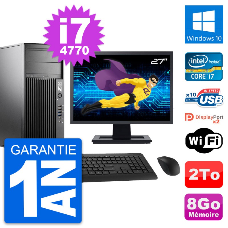 PC Tour HP WorkStation Z230 - Intel Core i7-4770 3.4 Ghz (8 Mo) - 8 Go DDR3 - Disque Dur 3,5" 2 To - Graveur DVD - Clef Wifi USB - Windows 10 - Livré avec Ecran 27" + clavier + souris (Marques et modèles variables) - Garantie 1 an.