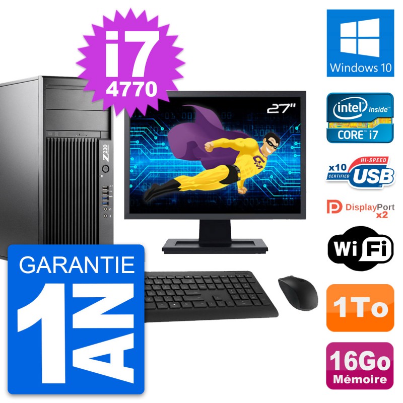 PC Tour HP WorkStation Z230 - Intel Core i7-4770 3.4 Ghz (8 Mo) - 16 Go DDR3 - Disque Dur 3,5" 1 To - Graveur DVD - Clef Wifi USB - Windows 10 - Livré avec Ecran 27" + clavier + souris (Marques et modèles variables) - Garantie 1 an.